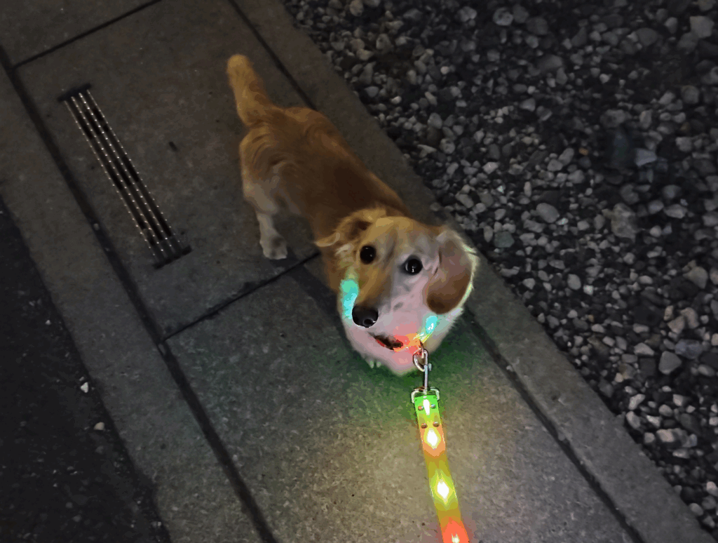 うちの子、光る首輪とリードをつけて、夜道でもピカピカに安全対策中です。