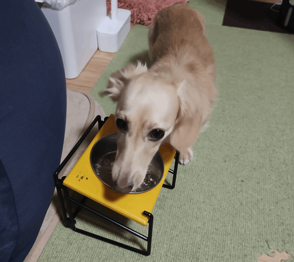 上の写真でも写っている通り、器を少し高くしてあげるだけで、食事や水を飲むときの姿勢がとてもラクになります。